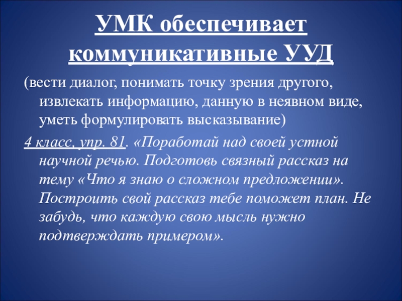 4 класс, упр. 81. «Поработай над своей устной научной речью. Подготовь связный рассказ на тему «Что я знаю о сложном предложении». Построить свой рассказ тебе поможет план. Не забудь, что каждую свою мысль нужно подтверждать примером».