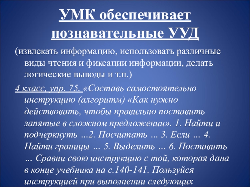 4 класс, упр. 75. «Составь самостоятельно инструкцию (алгоритм) «Как нужно действовать, чтобы правильно поставить запятые в сложном предложении». 1. Найти и подчеркнуть …2. Посчитать … 3. Если … 4. Найти границы … 5. Выделить … 6. Поставить … Сравни свою инструкцию с той, которая дана в конце учебника на с.140-141. Пользуйся инструкцией при выполнении следующих упражнений.»