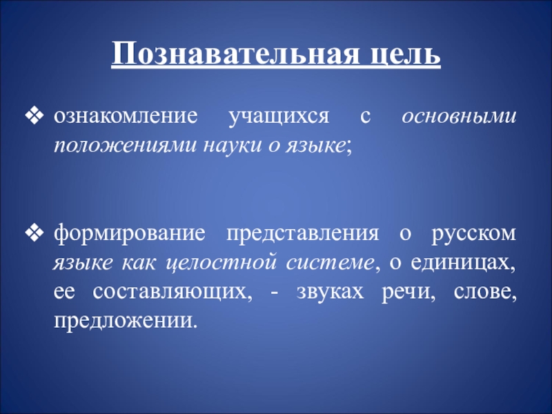 русском языке как целостной системе, о единицах, ее составляющих, - звуках речи, слове, предложении.