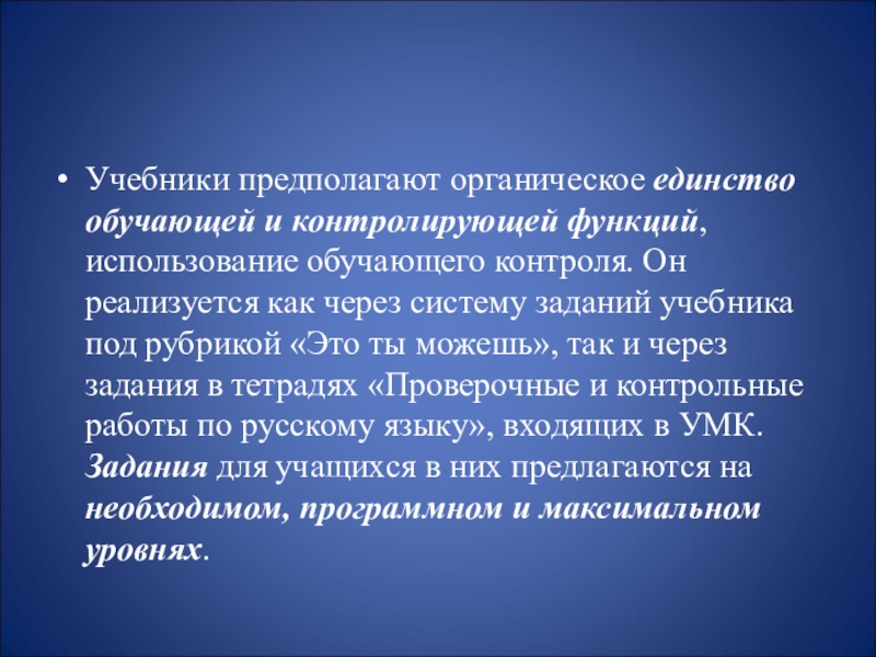 Учебники предполагают органическое единство обучающей и контролирующей функций, использование обучающего контроля.