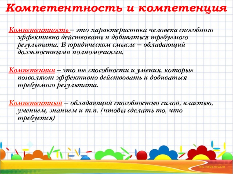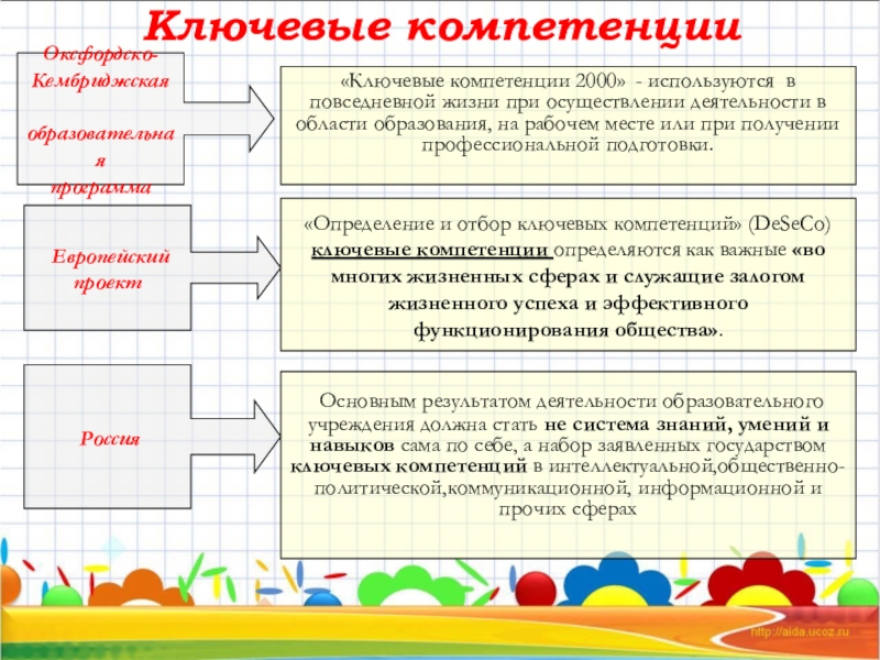 «Определение и отбор ключевых компетенций» (DeSeCo) ключевые компетенции определяются как важные «во многих жизненных сферах и служащие залогом жизненного успеха и эффективного функционирования общества».