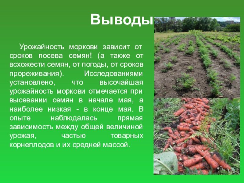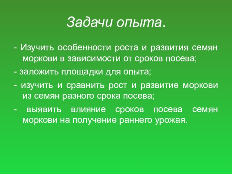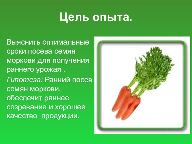 Гипотеза: Ранний посев семян моркови, обеспечит раннее созревание и хорошее качество продукции.