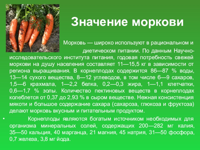 диетическом питании. По данным Научно-исследовательского института питания, годовая потребность свежей моркови на душу населения составляет 11—15,5 кг в зависимости от региона выращивания. В корнеплодах содержится 86—87 % воды, 13—14 сухого вещества, 8—12 углеводов, в том числе 6—9 сахаров, 1,5—6 крахмала, 1—2,2 белка, 0,2—0,3 жира, 1—1,1 клетчатки, 0,6—1,7 % золы. Количество пектиновых веществ в корнеплодах колеблется от 0,37 до 2,93 % в сыром веществе. Нежная консистенция мякоти и большое содержание сахара (сахароза, глюкоза и фруктоза) делают морковь вкусным и питательным продуктом.
