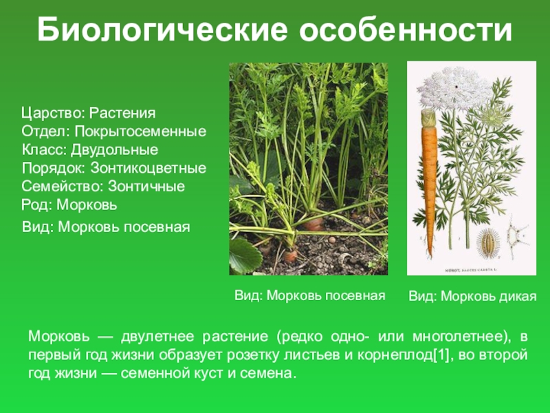 Морковь — двулетнее растение (редко одно- или многолетнее), в первый год жизни образует розетку листьев и корнеплод[1], во второй год жизни — семенной куст и семена.