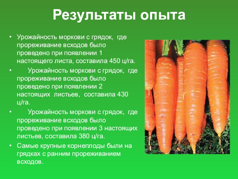 Урожайность моркови с грядок, где прореживание всходов было проведено при появлении 2 настоящих листьев, составила 430 ц/га.