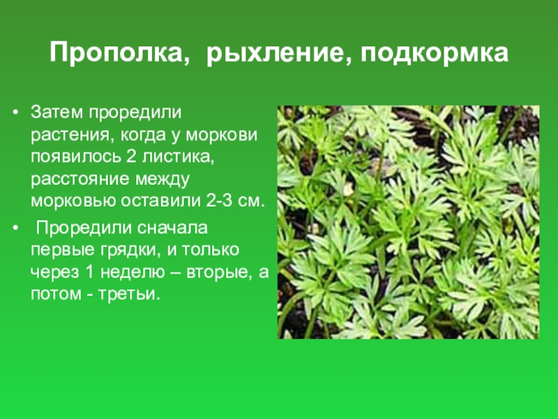 Затем проредили растения, когда у моркови появилось 2 листика,