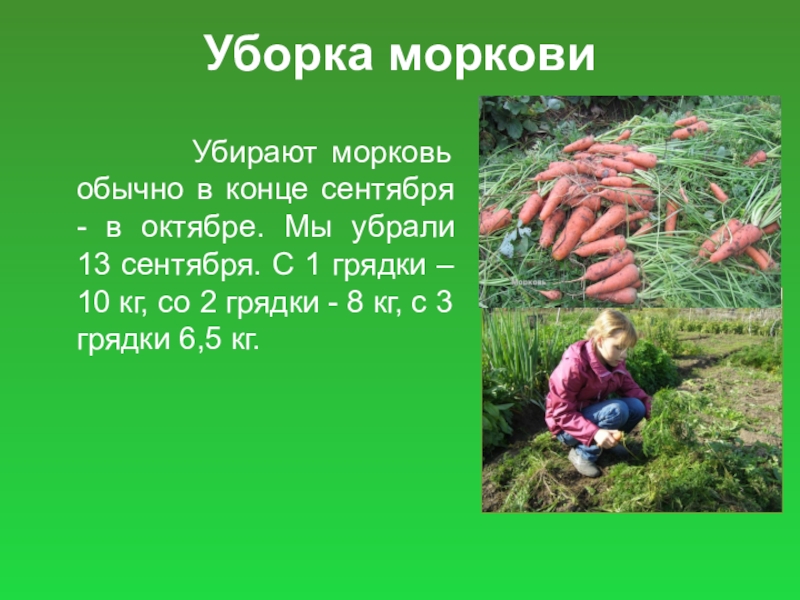 конце сентября - в октябре. Мы убрали 13 сентября. С 1 грядки – 10 кг, со 2 грядки - 8 кг, с 3 грядки 6,5 кг.