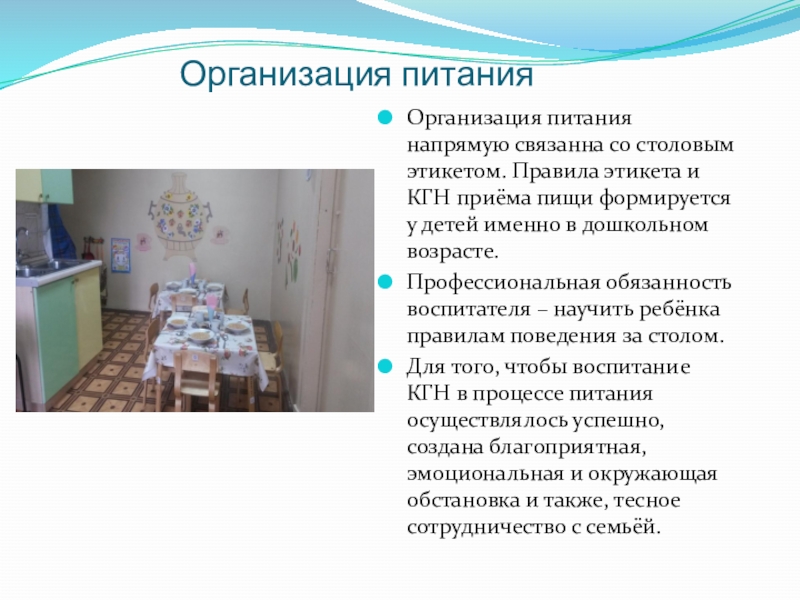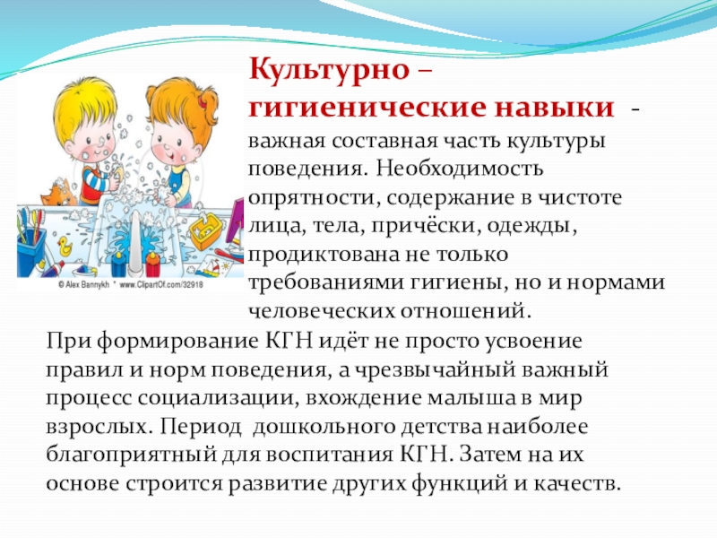 При формирование КГН идёт не просто усвоение правил и норм поведения, а чрезвычайный важный процесс социализации, вхождение малыша в мир взрослых. Период дошкольного детства наиболее благоприятный для воспитания КГН. Затем на их основе строится развитие других функций и качеств.