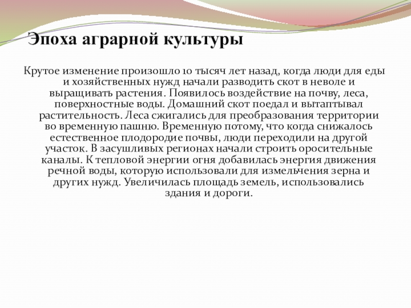 Эпоха аграрной культурыКрутое изменение произошло 10 тысяч лет назад, когда люди для еды и хозяйственных нужд