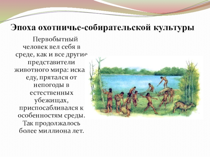 Эпоха охотничье-собирательской культуры    Первобытный человек вел себя в среде, как и все другие представители