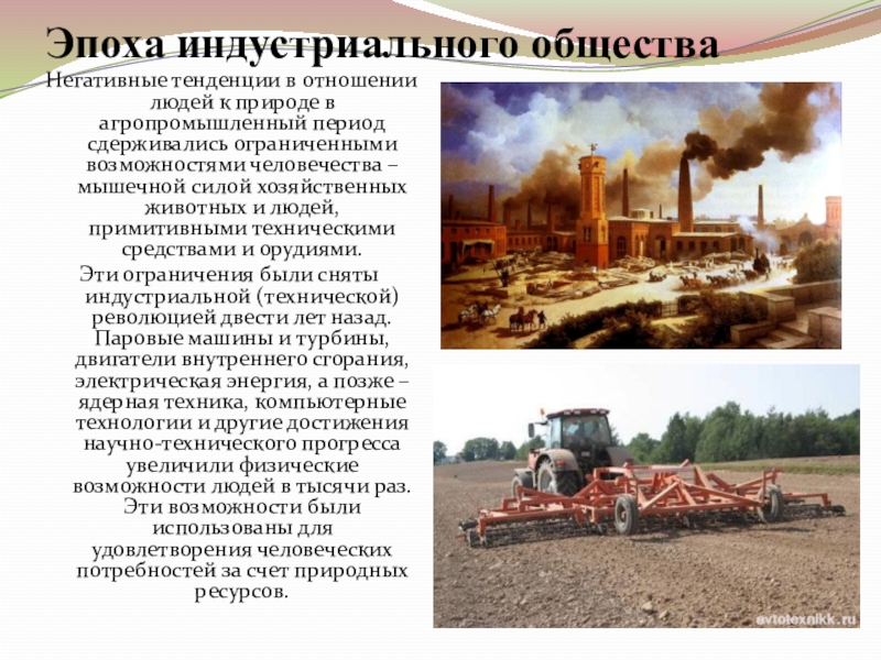 Эпоха индустриального обществаНегативные тенденции в отношении людей к природе в агропромышленный период сдерживались ограниченными возможностями человечества –