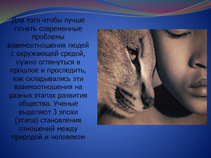 Для того чтобы лучше понять современные проблемы взаимоотношения людей с окружающей средой, нужно оглянуться в прошлое и проследить, как складывались эти взаимоотношения на разных этапах развития общества. Ученые выделяют 3 эпохи (этапа) становления отношений между