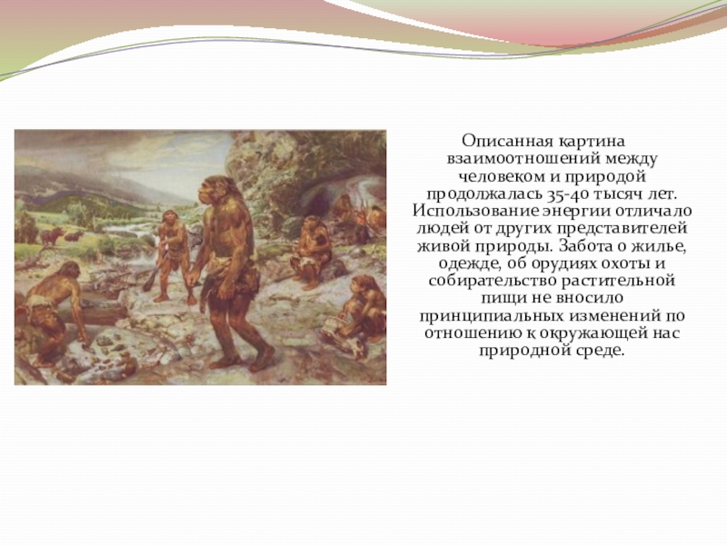Описанная картина взаимоотношений между человеком и природой продолжалась 35-40 тысяч лет. Использование энергии отличало людей от