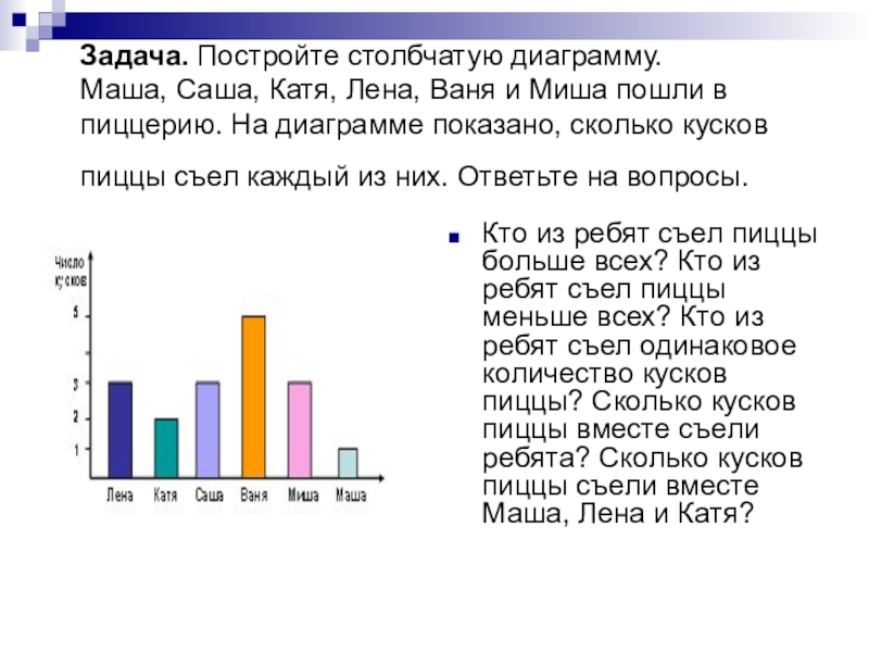 Кто из ребят съел пиццы больше всех? Кто из ребят съел пиццы меньше всех? Кто из ребят съел одинаковое количество кусков пиццы? Сколько кусков пиццы вместе съели ребята? Сколько кусков пиццы съели вместе Маша, Лена и Катя?
