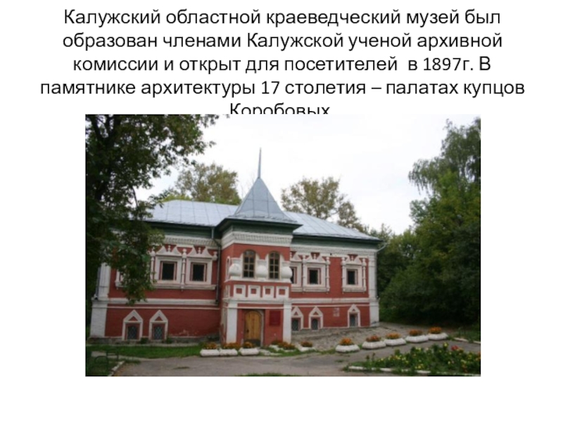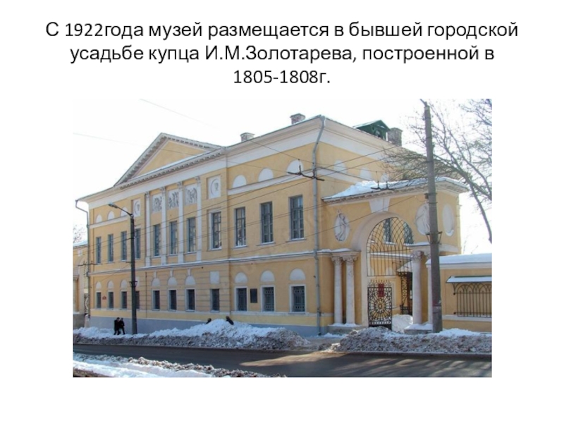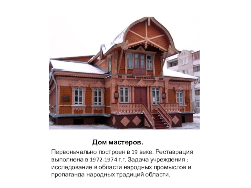 Первоначально построен в 19 веке. Реставрация выполнена в 1972-1974 г.г. Задача учреждения : исследование в области народных промыслов и пропаганда народных традиций области.