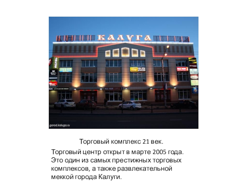 Торговый центр открыт в марте 2005 года. Это один из самых престижных торговых комплексов, а также развлекательной меккой города Калуги.