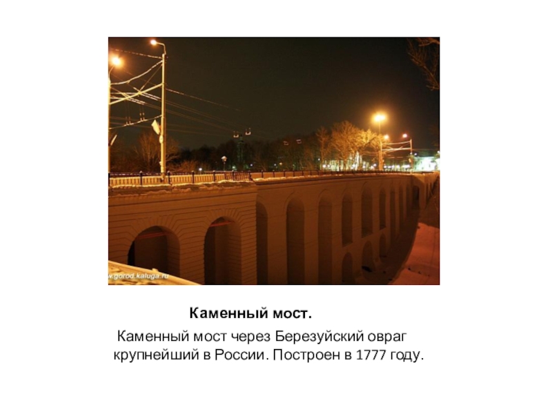 Каменный мост через Березуйский овраг крупнейший в России. Построен в 1777 году.