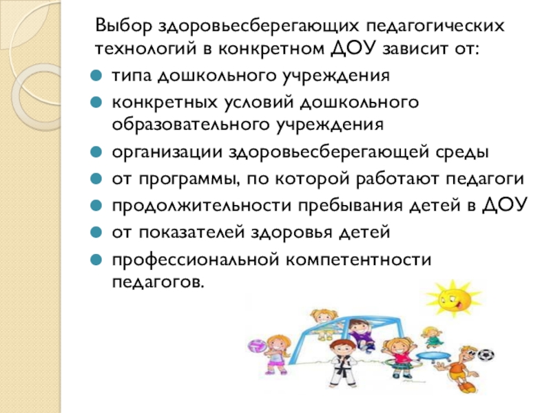 Слайд 11Выбор здоровьесберегающих педагогических технологий в конкретном ДОУ зависит от: