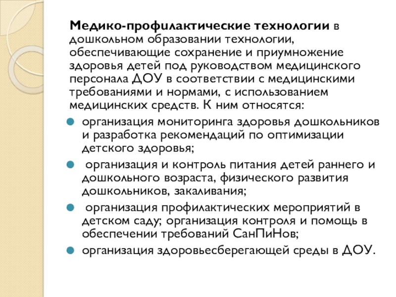 Медико-профuлактические технологии в дошкольном образовании технологии, обеспечивающие сохранение и приумножение здоровья детей под руководством медицинского персонала ДОУ в