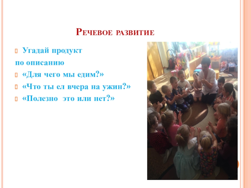 Речевое развитиеУгадай продукт по описанию«Для чего мы едим?»«Что ты ел вчера на ужин?»«Полезно это или нет?»