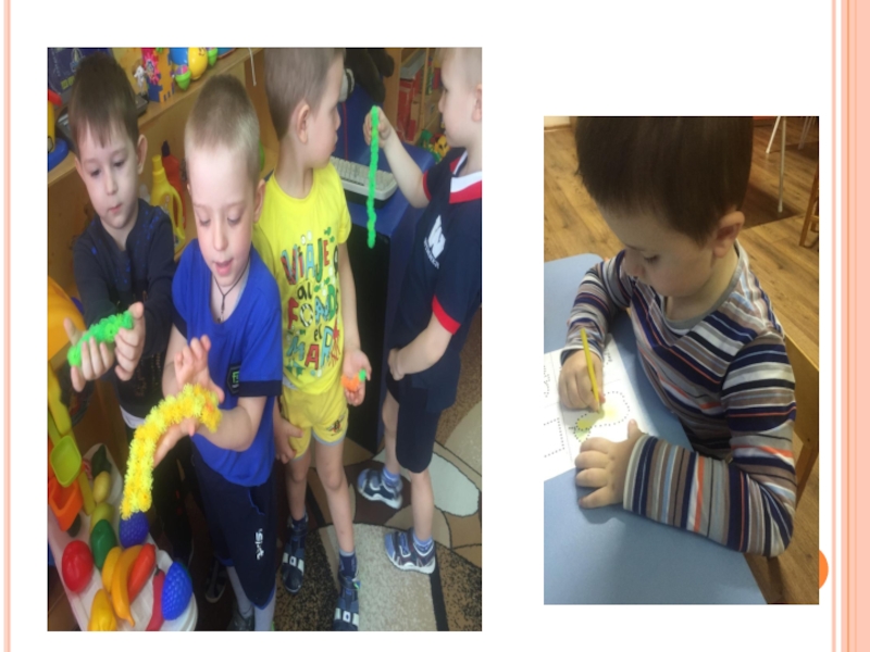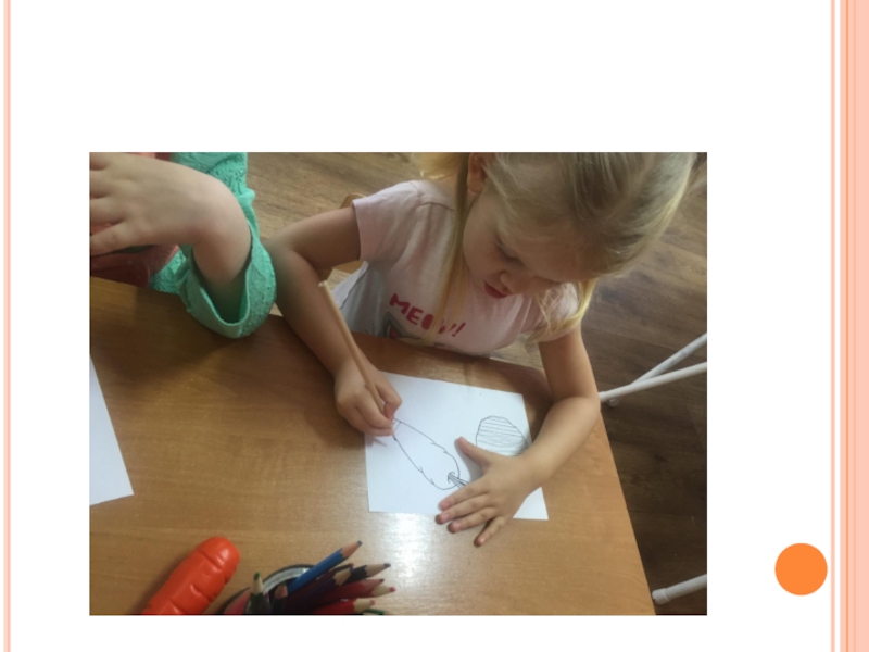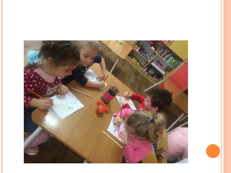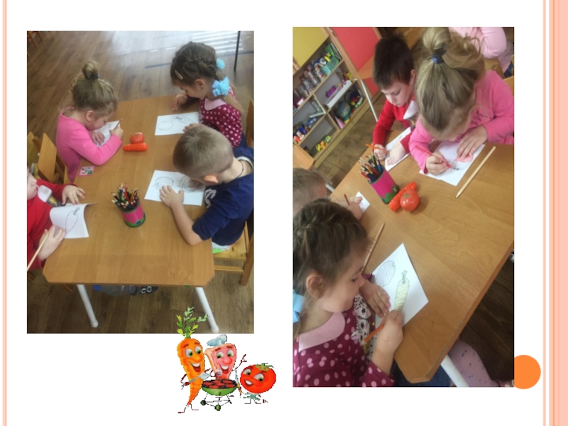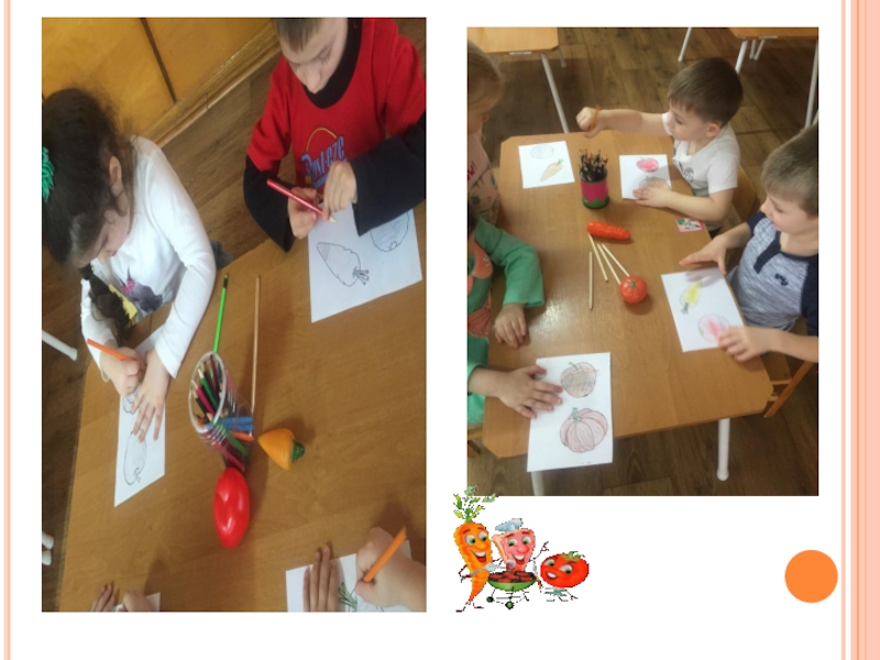 уголке творчества: раскраски, штриховка овощей и фруктов, трафареты