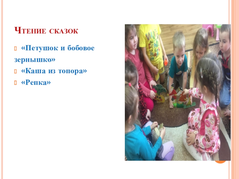 Чтение сказок«Петушок и бобовое зернышко»«Каша из топора»«Репка»