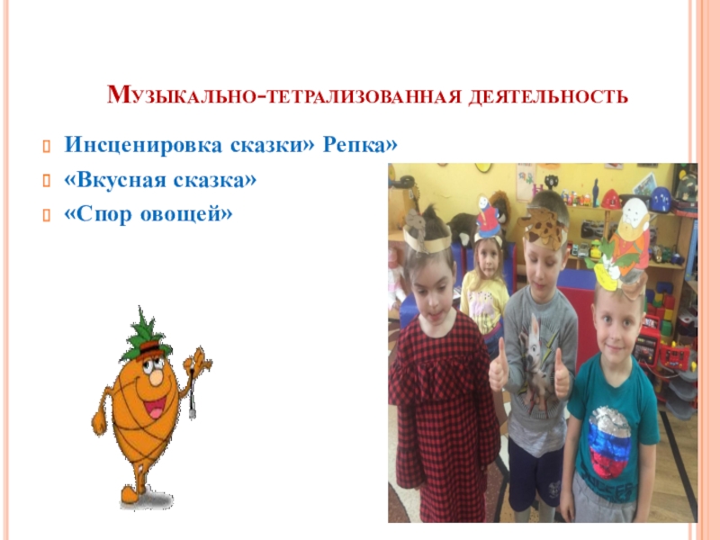 Музыкально-тетрализованная деятельностьИнсценировка сказки» Репка»«Вкусная сказка»«Спор овощей»
