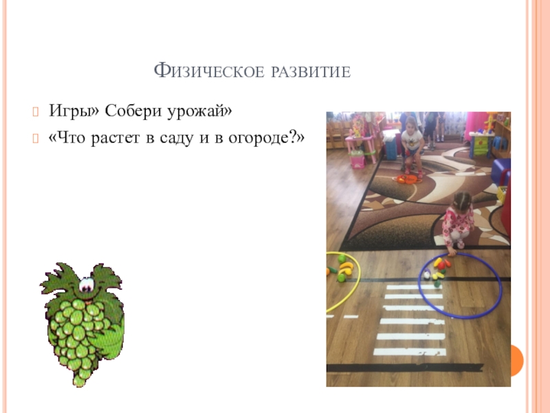 Физическое развитиеИгры» Собери урожай»«Что растет в саду и в огороде?»