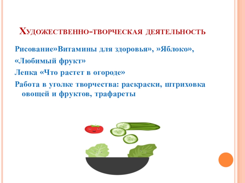 Художественно-творческая деятельностьРисование»Витамины для здоровья», »Яблоко»,«Любимый фрукт»Лепка «Что растет в огороде»Работа в уголке творчества: раскраски, штриховка овощей и
