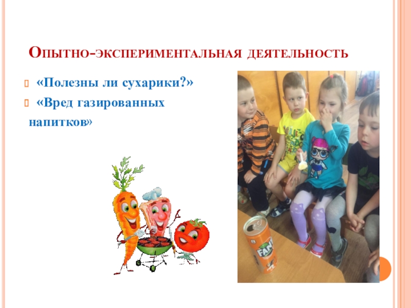 Опытно-экспериментальная деятельность«Полезны ли сухарики?»«Вред газированных напитков»