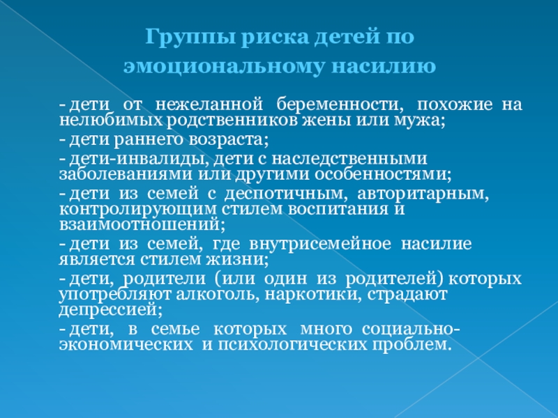 Слайд 12Группы риска детей по эмоциональному насилию