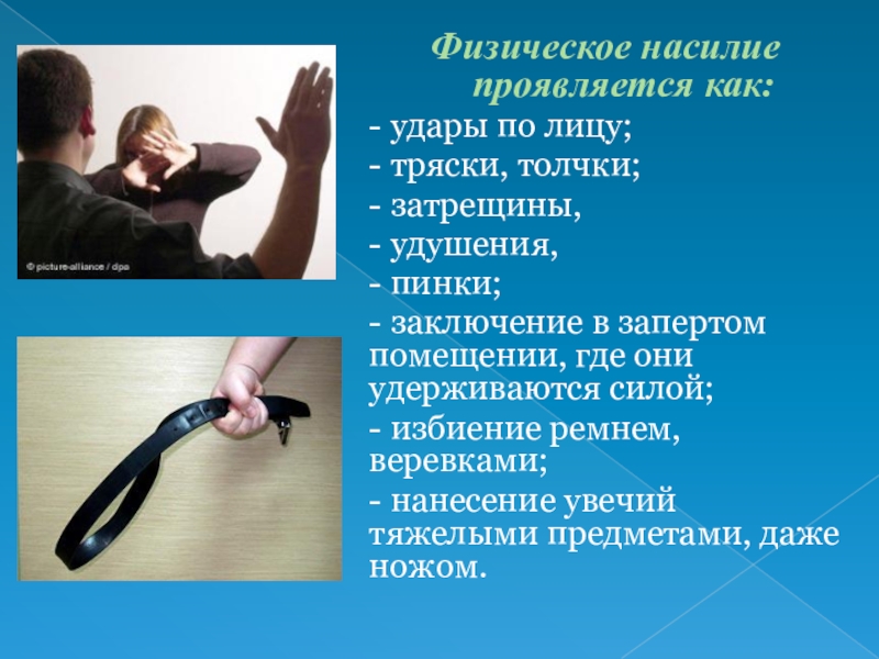 Слайд 19Физическое насилие проявляется как: