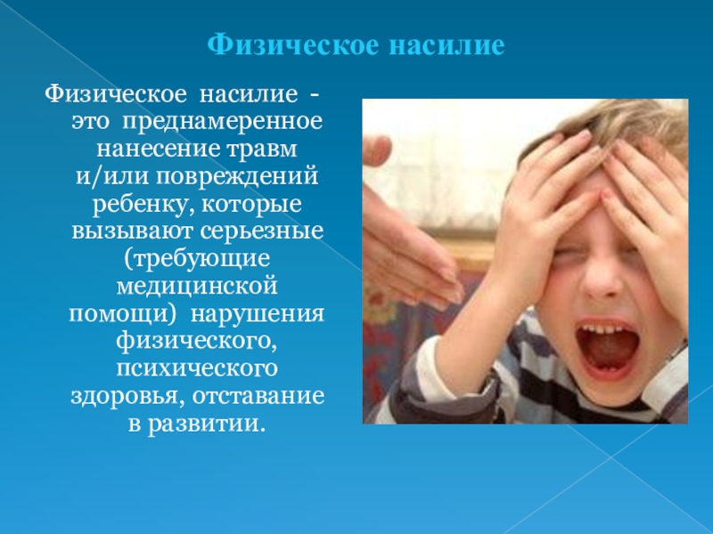 Физическое насилие - это преднамеренное нанесение травм и/или повреждений ребенку,