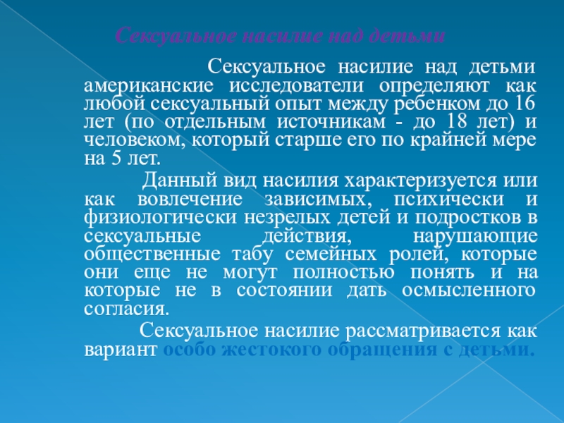 Сексуальное насилие рассматривается как вариант особо жестокого обращения с детьми.