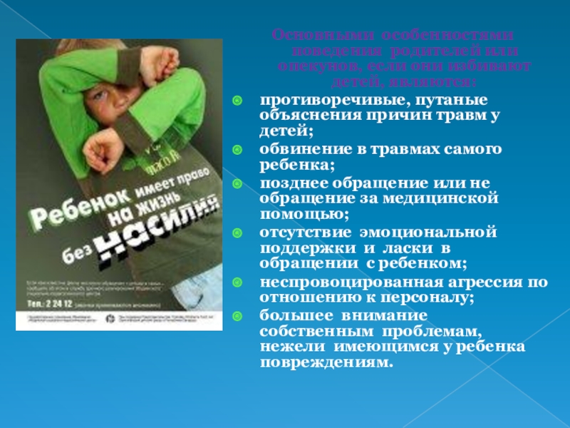 Слайд 24Основными особенностями поведения родителей или опекунов, если они избивают детей, являются: