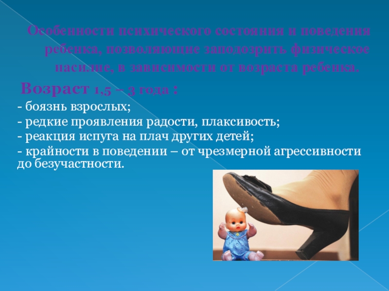Слайд 22Особенности психического состояния и поведения ребенка, позволяющие заподозрить физическое насилие, в