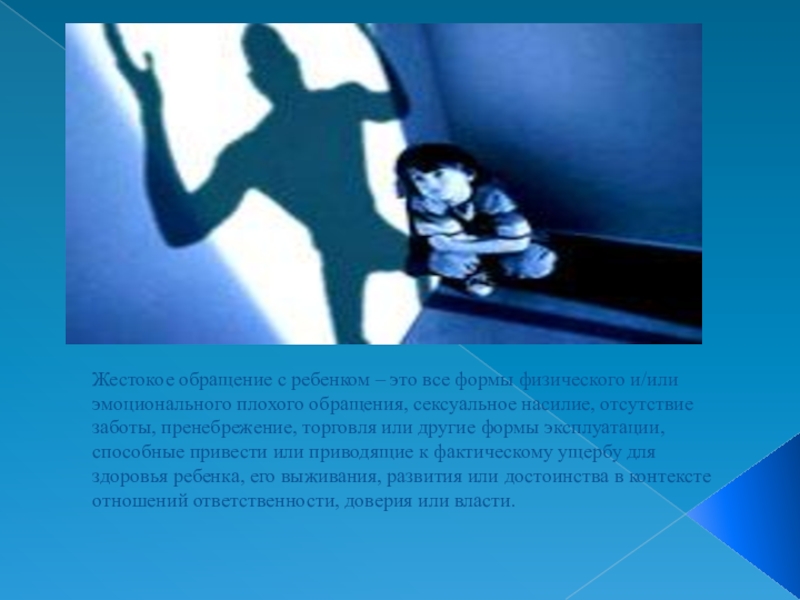плохого обращения, сексуальное насилие, отсутствие заботы, пренебрежение, торговля или другие формы эксплуатации, способные привести или приводящие к фактическому ущербу для здоровья ребенка, его выживания, развития или достоинства в контексте отношений ответственности, доверия или власти.