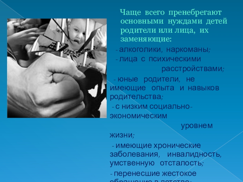 Слайд 7 Чаще всего пренебрегают основными нуждами детей родители или
