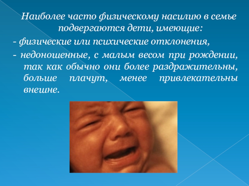 Слайд 20 Наиболее часто физическому насилию в семье подвергаются дети, имеющие: