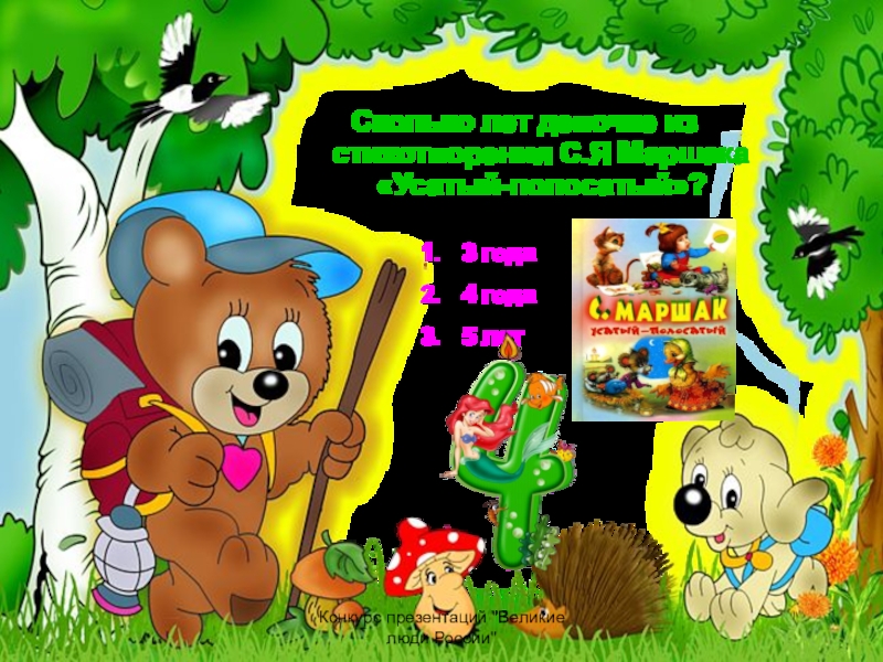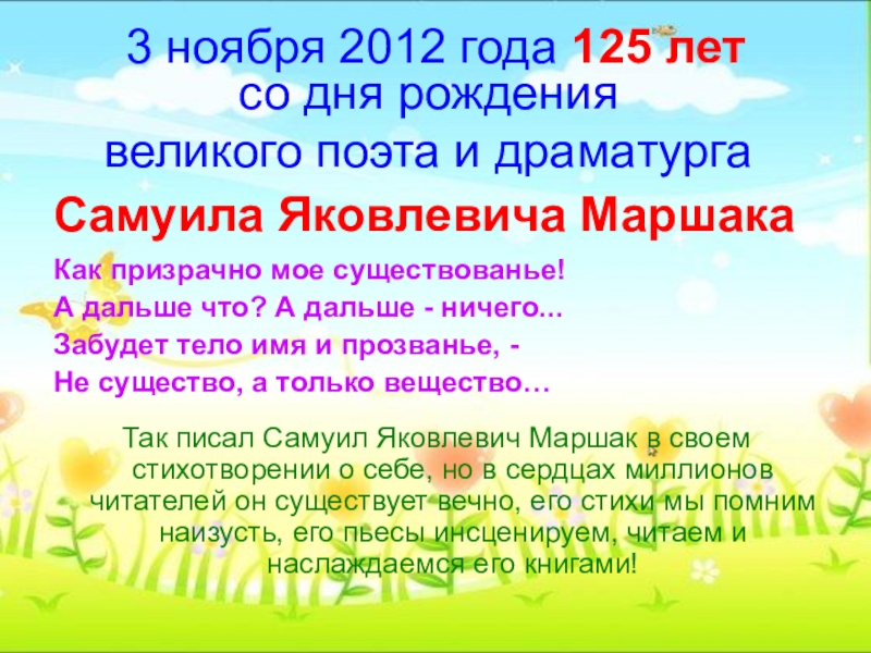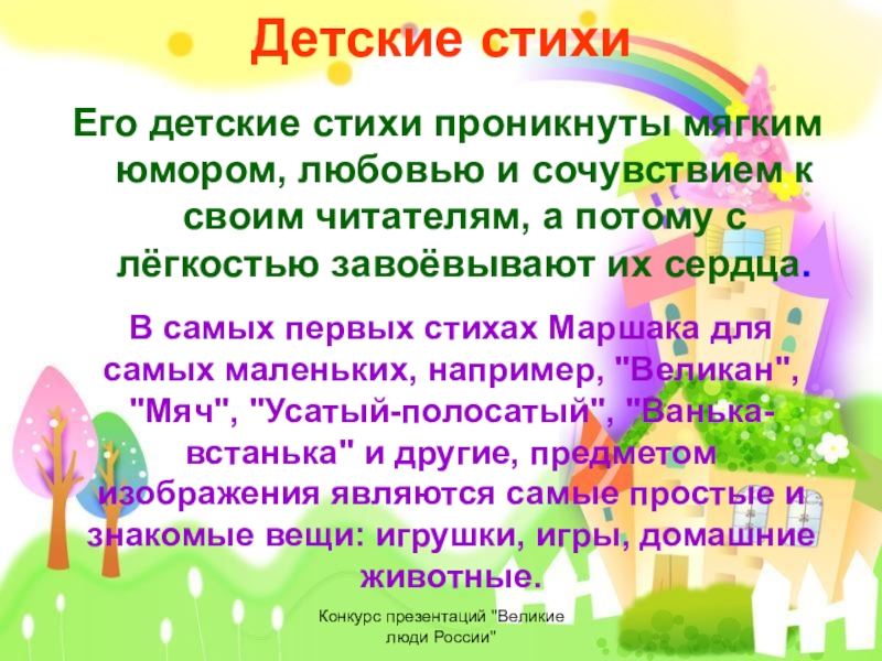 В самых первых стихах Маршака для самых маленьких, например, "Великан", "Мяч", "Усатый-полосатый", "Ванька-встанька" и другие, предметом изображения являются самые простые и знакомые вещи: игрушки, игры, домашние животные.