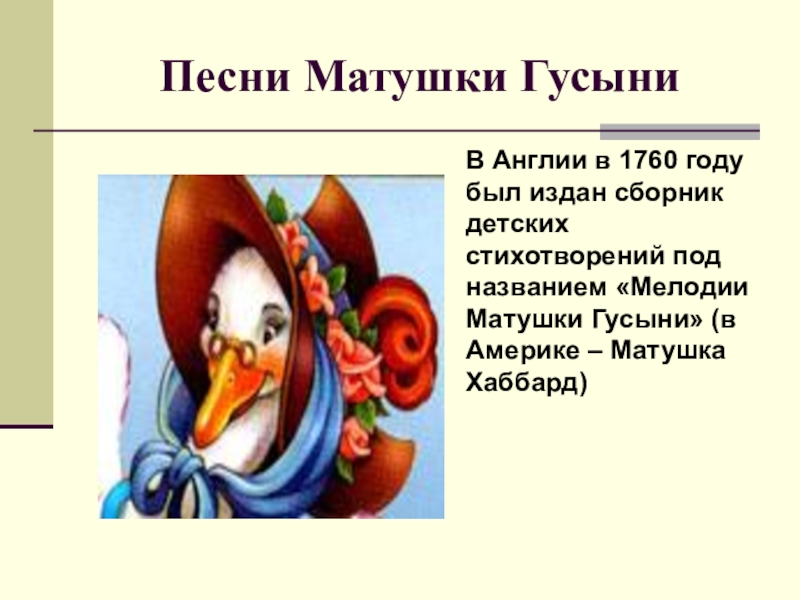 сборник детских стихотворений под названием «Мелодии Матушки Гусыни» (в Америке – Матушка Хаббард)