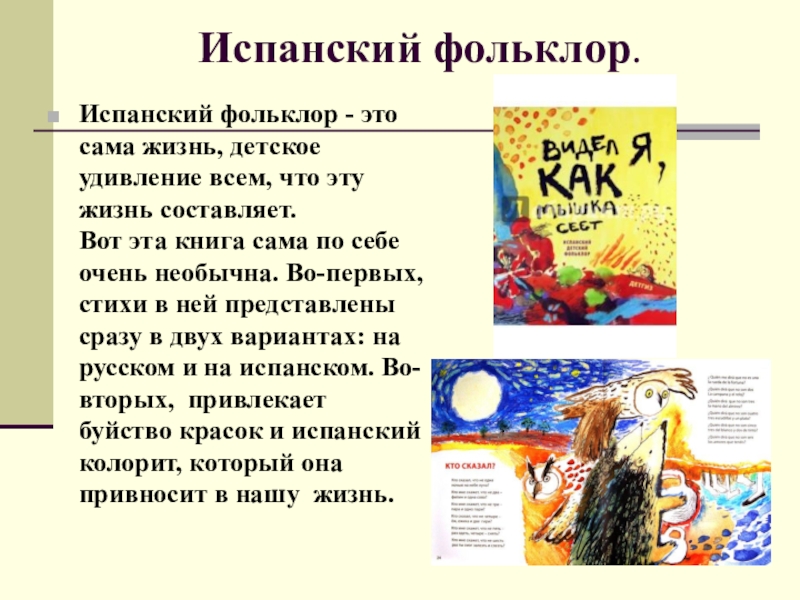 Вот эта книга сама по себе очень необычна. Во-первых, стихи в ней представлены сразу в двух вариантах: на русском и на испанском. Во-вторых, привлекает буйство красок и испанский колорит, который она привносит в нашу жизнь.