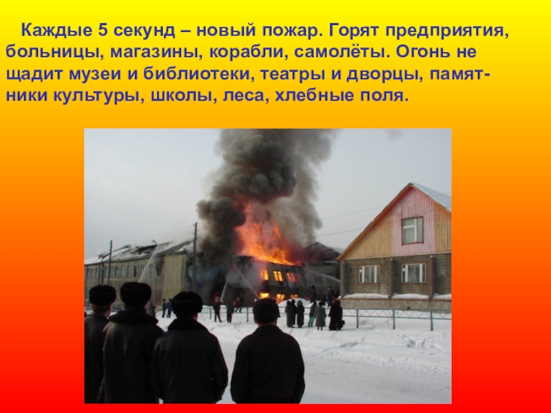 Слайд 20 Каждые 5 секунд – новый пожар. Горят предприятия,