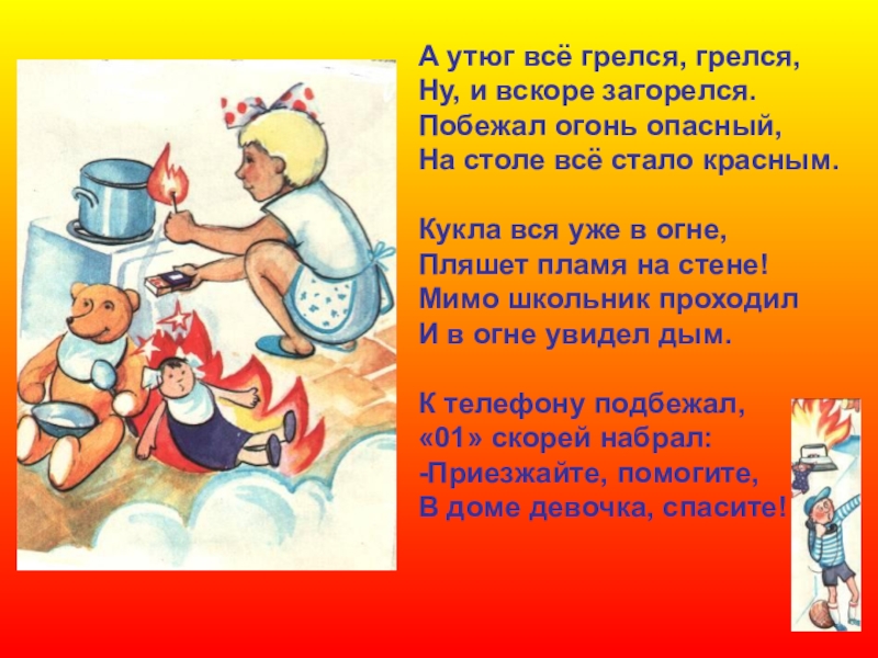 ленно сообщить о пожаре взрослым. А по мере сил и