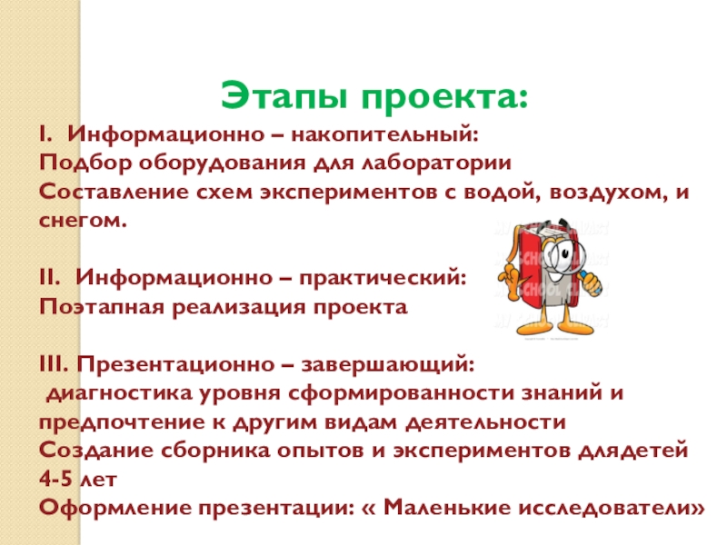 Этапы проекта:I. Информационно – накопительный:Подбор оборудования для лабораторииСоставление схем экспериментов с водой, воздухом, и снегом.II. Информационно –