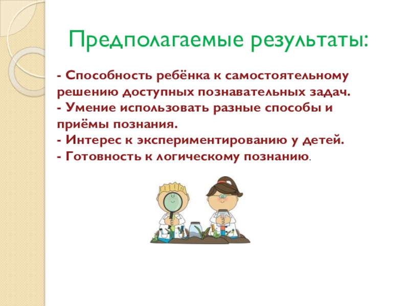 Предполагаемые результаты:- Способность ребёнка к самостоятельному решению доступных познавательных задач.- Умение использовать разные способы и приёмы познания.-