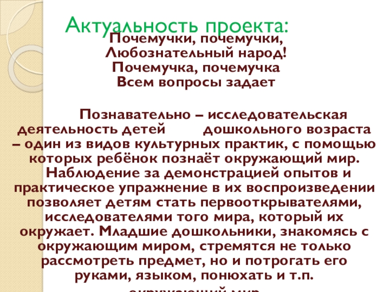 Актуальность проекта:Почемучки, почемучки, Любознательный народ! Почемучка, почемучка Всем вопросы задает     Познавательно – исследовательская