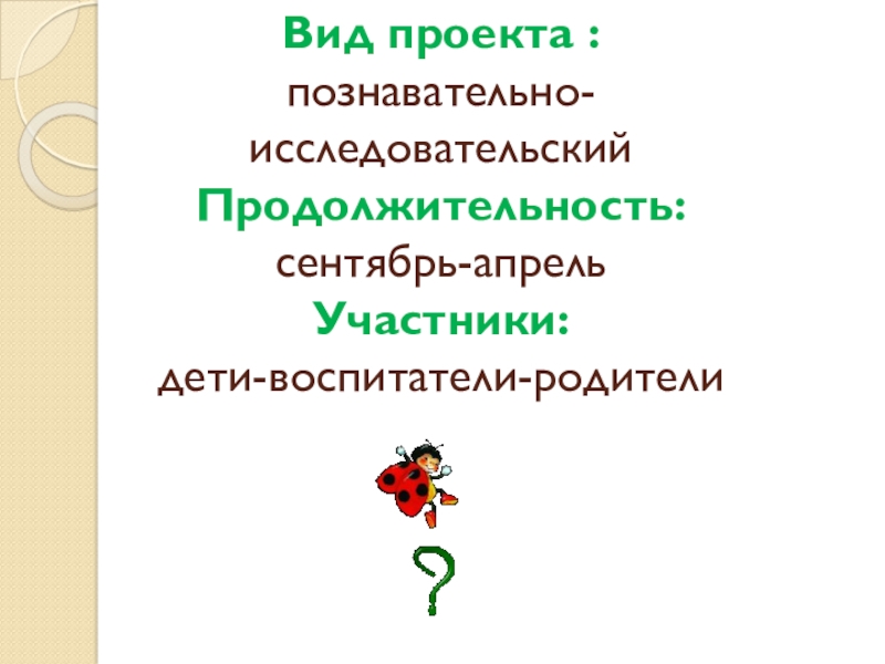 Слайд 2 Вид проекта : познавательно-исследовательский Продолжительность: сентябрь-апрель Участники: дети-воспитатели-родители