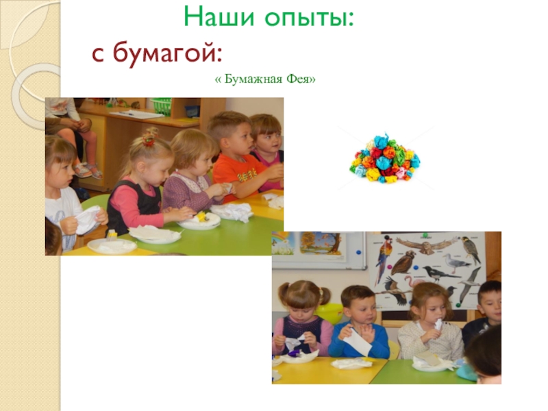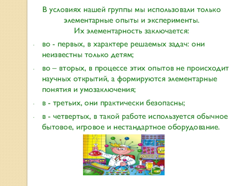 Слайд 16В условиях нашей группы мы использовали только элементарные опыты и эксперименты. Их