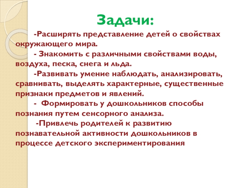 Задачи:    -Расширять представление детей о свойствах окружающего мира.    - Знакомить с